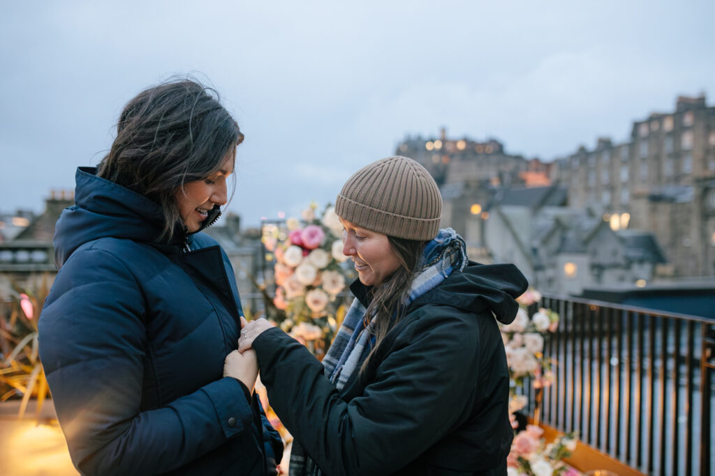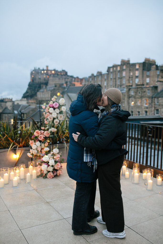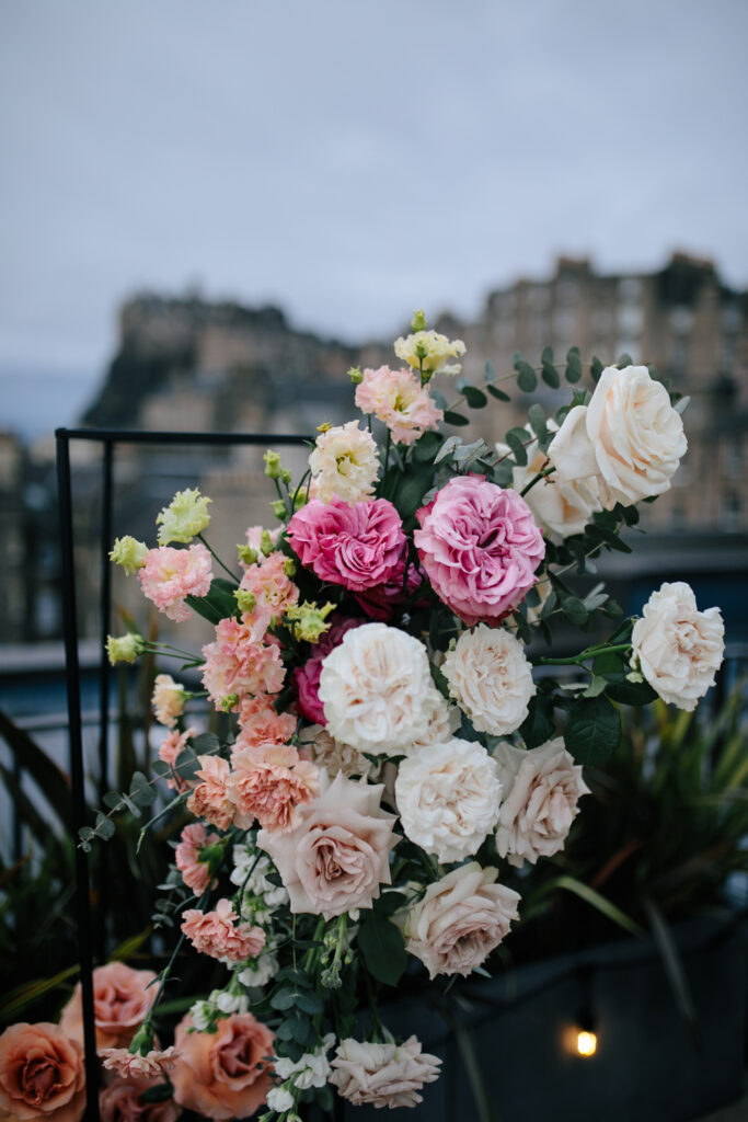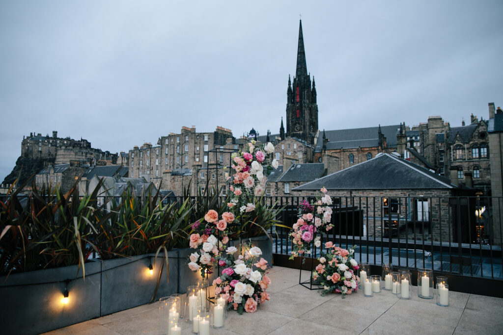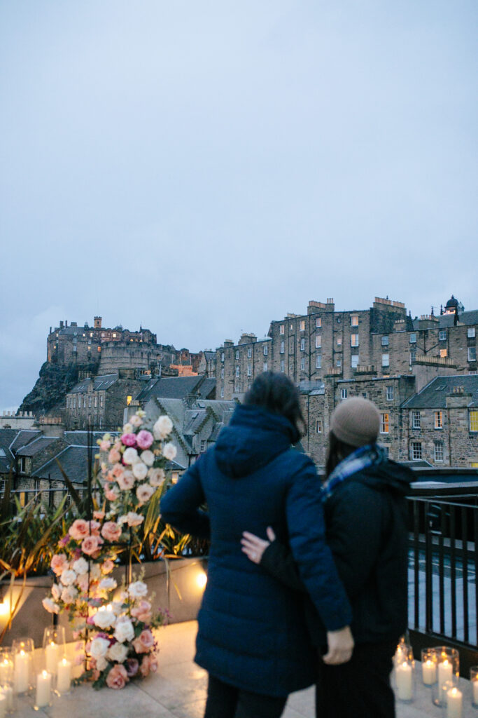 A rooftop setup for the proposal of B & B at Virgin Hotels in the heart of Edinburgh, with stunning views of Edinburgh Castle. The space comes alive with a beautiful floral design, featuring seasonal flowers, romantic color tones, and candlelit highlights. Perfect for weddings, proposals, or special events, the flowers create a memorable, picture-perfect atmosphere with the castle as a breathtaking backdrop.